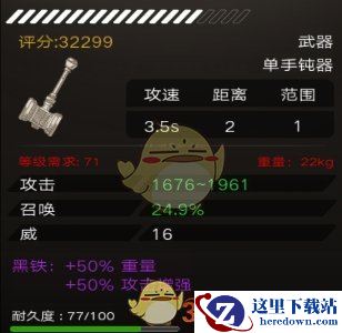 上图战锤右边重量22KG,超出腕力,所以攻速降低,但正好触发不朽锁铐特效,增强伤害。武器战锤的黑铁也是前缀。
