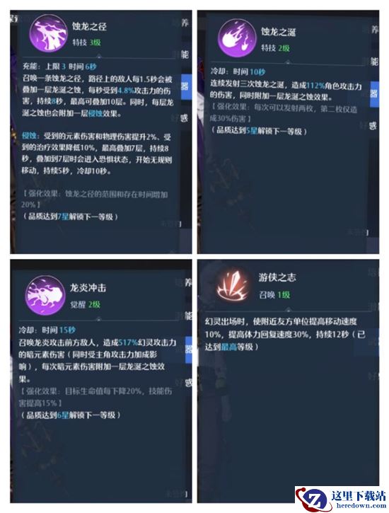 龙炎冲击:召唤龙炎攻击前方敌人,造成暗元素伤害(同时受主角攻击力加成影响),每次暗元素伤害附加一层龙涎之蚀效果。