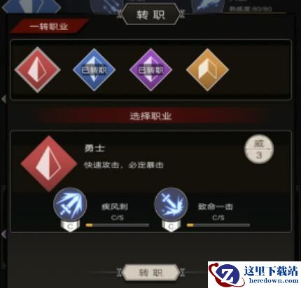 在玩家进行“一转”“二转”“三转”和“四转”时,选择职业后便拥有了与职业相对应的技能,每个职业都自带两种技能。不同职业的初始技能等阶是不同的,一转职业的两个初始技能等阶均为C,二转职业的初始技能由一个B等阶的主动技能和一个S等阶的被动技能搭配而成,三转职业的两个初始技能等阶均为为A,而四转职业均为S。这里要注意无论当前的技能是什么等阶,都可以经过C-B-A-S的路线来逐步升阶哦,S级即为满阶。