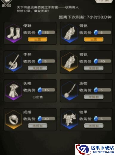 1、市集中的商品及对应品质是指定好的。例如蓝色品质的铠甲罗列在市集中,而我们仅拥有紫色品质的铠甲,市集中便会表明"未拥有”。即便你所拥有的装备品质更高,也卖不出去。当然,每隔一定时间收购商人的需求便会变动,市集内的商品会进行一次刷新。