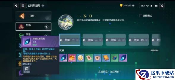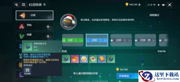 第二部分是日常特训,玩家会从每日挑战中获得一些基础材料,包括初级武器灵石,幻灵经验凭证以及金钱和经验。