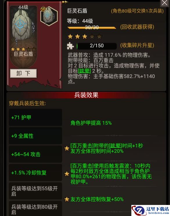 巨灵石盾。对于兵装很多人有一个误区就是,我必须抽到UR才玩,UR好, 加属性多。但是这群人以为的是加到备上,但其实是加到兵装左边的这一排人物属性。UR提供的人物属性更高,仅此而已。