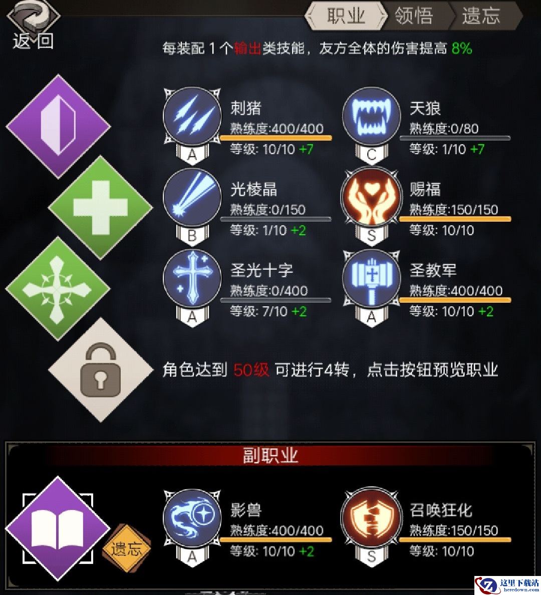 3、三转:木人或者圣教军;副职业:火鼠;技能:刺猪、(木人或圣教军)、(火鼠或天狼)、(圣十字,有生命绽放再换)具体选择什么可以跟据图来选择,抗得住用木人,抗不住用圣教军,打不过图转个职业,换换怪试试。