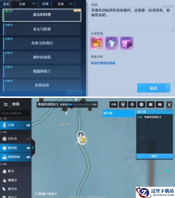 二、跟仙萝对话接取任务,通过自由烹饪获得清蒸鱼。清蒸鱼:1卷心菜+2蘑菇+2鱼肉。