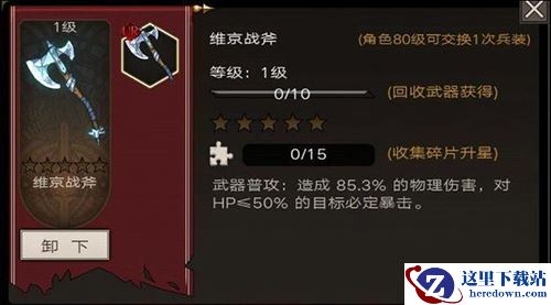 维京战斧的兵装特效目标HP小于50%必定暴击,3星生命上限20%,双持翻倍,4星暴击附加迟缓,5星迟缓5层变冰冻1秒。