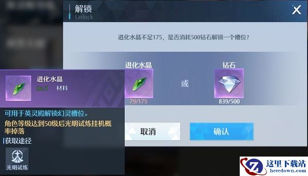 1、英灵殿需人物等级到达59级,其初始槽位为2,通过消耗道具【进化水晶】或钻石解锁。【进化水晶】为光明试炼玩法50层后产出。