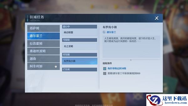 1、点开区域任务后,我们能直接看到相应地区的任务详情和接取条件,除了弗迪丝波姆冻土外的地区都只有三个区域任务,每个任务都需要角色等级和地区探索度达到一定程度。