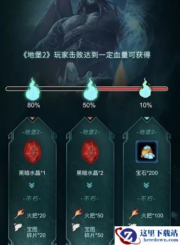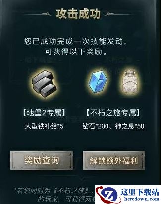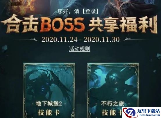 步骤2:登录账号后,将根据大家账号下激活《不朽之旅》及《地下城堡2》的情况,获得对应游戏技能卡,发动技能卡就可以为抗击BOSS作出贡献啦!!双BOSS血量降低到不同程度,即可解锁对应奖励。击杀BOSS奖励将在活动结束后统一通过游戏内邮件发放,无需在页面上领取。