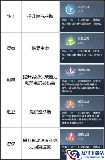 例如:幻灵编队内,附体幻灵为斗士,其他三个佣兵职业分别为近卫、贤者和影舞。那么在释放幻灵觉醒技后,就能在12x连携段数(4连携可持续60秒)秒内为我们提供20%怒气获取、40%生命上限的壁垒盾、20%弱点识破力、10%弱点识破伤害,和1.5%的每秒回复生命。