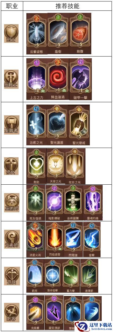抽到能用的ss角色后一定要把自带的技能升满,其次我推荐一下各职业好用的技能,推荐前期优先升级这些技能。