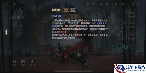 2.5秒内损失血量超过生命最大值的20%时,喝下烈活进入持续3秒的醉拳状态,立即回复100( 每级提升15)(+7%最大生命加成)的生命,提升自身20%的伤赛减免。普攻范围略微增加,会向目标小幅度位移并连续发动两次拳击,每次拳击造成攻击力55%的物理伤害每攀廷长该状态0.20秒,最多持续7秒,状态结束后,距离下次醉酒有固定6秒的冷却间隔。
