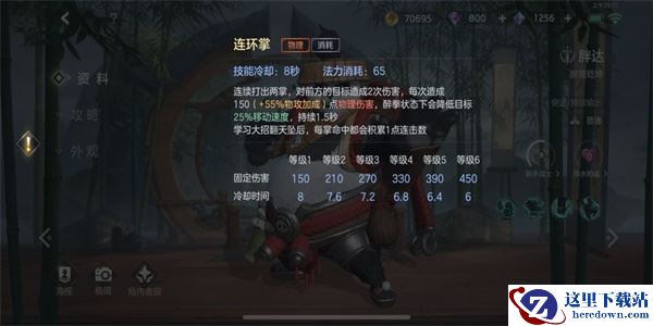 连续打出两掌,对前方的目标透成2次伤害,每次造成150( +55%物攻加成)点物理伤害,醉黎状下会降低目标25%移动速度,持续1.5秒学习大招翻天坠后,每拿命中都会积累1点连击数。