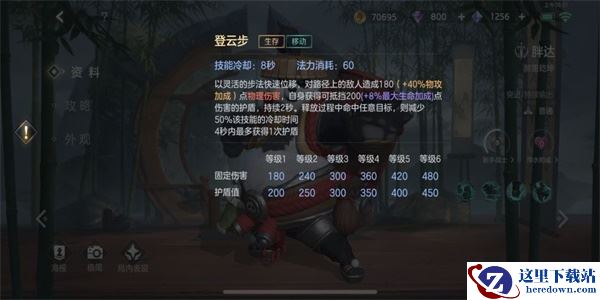 以灵活的步法快遗位移,对路径上的敌人透成180( +40%物攻加成》点物理伤害,自身获得可抵挡200(+8%最大生命加成).点伤博的护盾,持续2秒。释敛过程中命中任意目标,则减少50%该技能的冷却时间4秒内最多获得1次护盾。