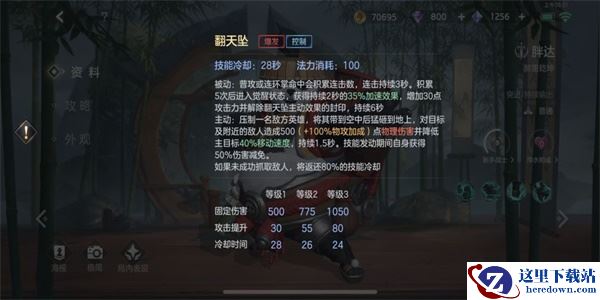 披动:普攻或连环掌命中会职默连击数,连击持续3秒。积默5次后进入觉醒状态,获得持续2秒的35%加造效果,增加30点攻击力并解除翻天坠主动效果的封印,持续6秒主动:压制一名数方英雄,将其带到空中后经砸到地上,对目标及附近的敌人造成500(+100%物攻加]点物理伤害并降低主目标40%移动速度,持续1.5秒。技能发动期间自身获得50%伤售减免,如果未成功抓取敌人,将返还80%的技施冷却。