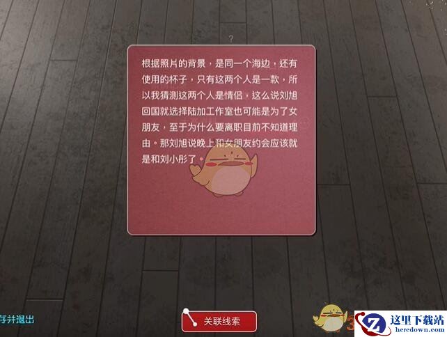 情侣:两名员工在平时是同事的关系,其实在私底下为情侣关系。线索位置:将找到的拍立得照片,两个马克杯,一张照片,以及刘旭和刘小彤进行关联,得到这层线索。
