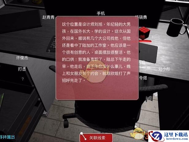 刘旭:公司的设计师。线索位置:将找到的测距仪,马克杯,辞职报告,魔方进行关联,得到这个线索。