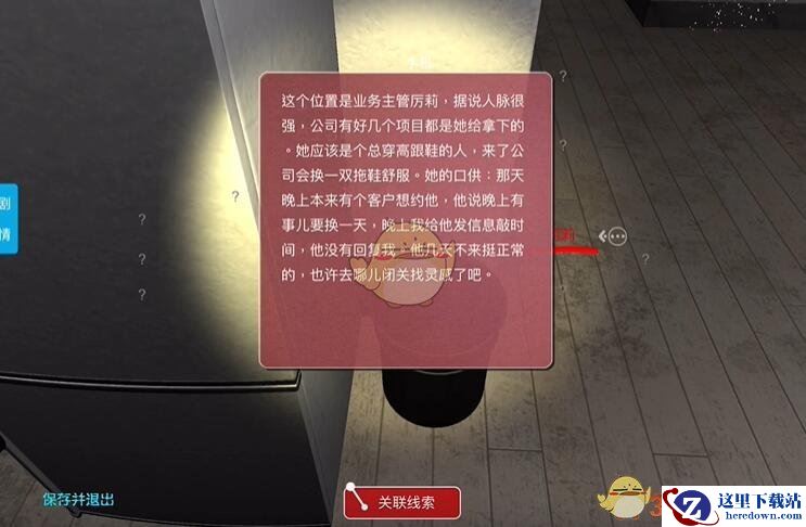 这个位置是业务主管厉莉,据说人脉很强,公司有好几个项目都是她给拿下的。她应该是一个总是穿着高跟鞋的人,来了公司之后总会换一双拖鞋舒服,以她的口供:那天晚上本来有个客户相约他,他说晚上有事儿要换一天,晚上我给他发信息敲时间,他没有回复我。他几天不来挺正常的,也许去哪儿闭关去寻找灵感了吧。