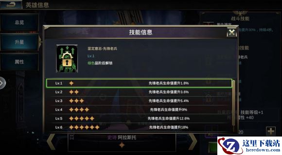 比如,下图中阿拉斯托的被动技能“坚定意志”,它所带来的加成就是针对近战类型的先锋老兵,生命值做了百分比加成,再配以第二个被动技能“信仰祷言”,其在阿拉斯托的带领下,先锋老兵的生命值,整体上升3.2%。