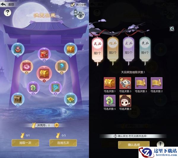 1.道友们可以使用洪荒符破除禁制,获得仙藏中的宝物。仙藏中的宝物全部为自主选择,分为天、地、玄、黄四档,可以各选择1-4种道具。