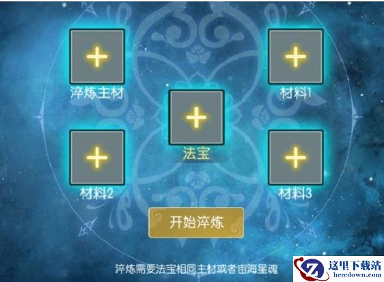 法宝淬炼升星需要消耗与法宝相同的主材或者用宙海星魂来代替。已炼制的法宝无法直接作为附属材料进行淬炼。宙海星魂可通过仙盟商店兑换,也可通过分解神器获得(在仙盟商店兑换天门石,使用天门石可以将1个神器还原为2个宙海星魂)
