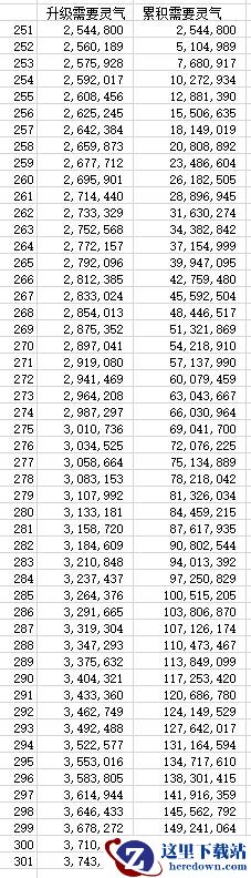 250级灵池面板加成大概是3600,人物面板假设为A,250级灵池本身存储了大概255万灵气,250级到300级需要的灵气总量根据前面表格为152951525。