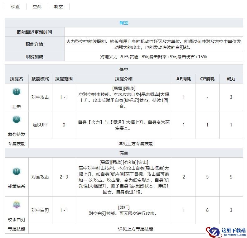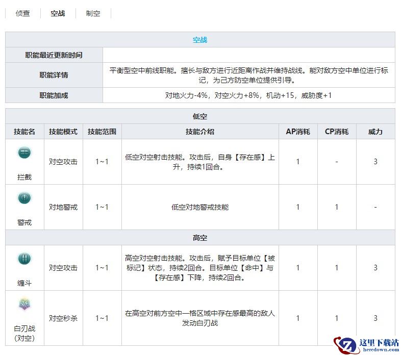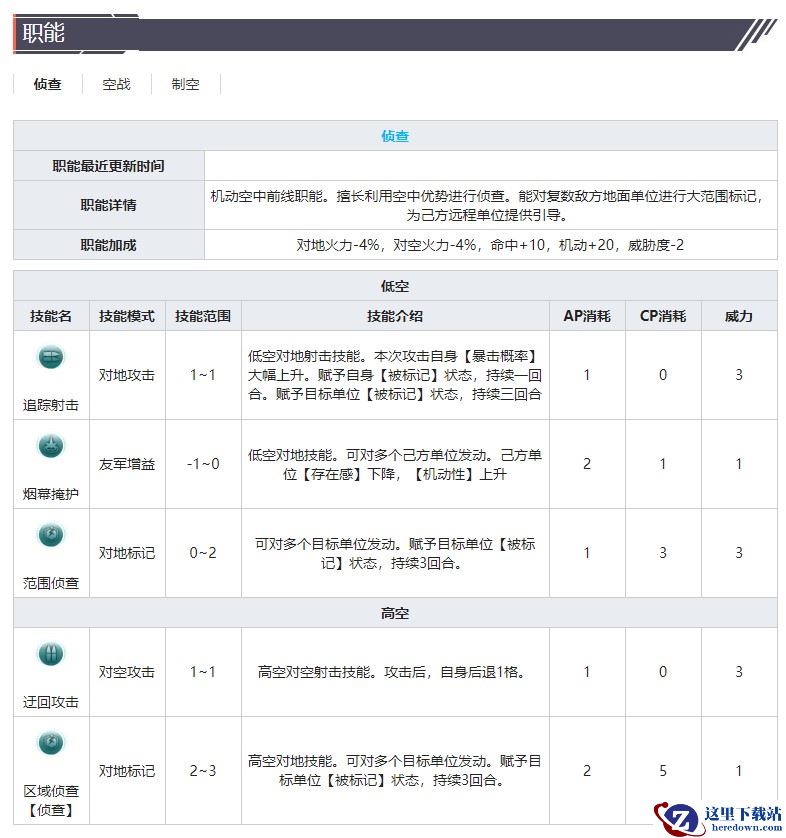 高空对空射击技能。攻击后,降至低空并向后移动两格。下回合攻击后,可对同一目标单位再进行一次攻击。