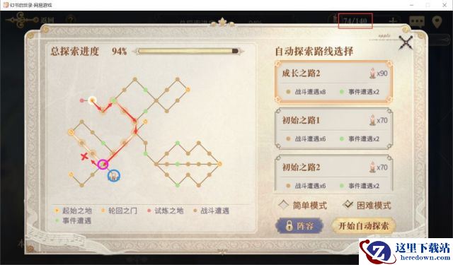 因此我们通过打书签/契印十之类的办法,把剩余体力控制到60-70之间,然后再点开自动探索,就会自动在粉圈处停下。