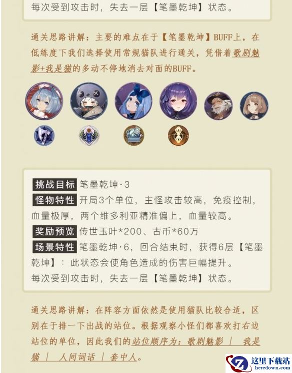 在过关的时候,主要要留意的是三只怪身上的【笔墨乾坤】BUFF,必要时刻甚至需要计算当前回合出手中能否将BUFF清完,基本上开局稳定住局面后,后面就比较简单了。
