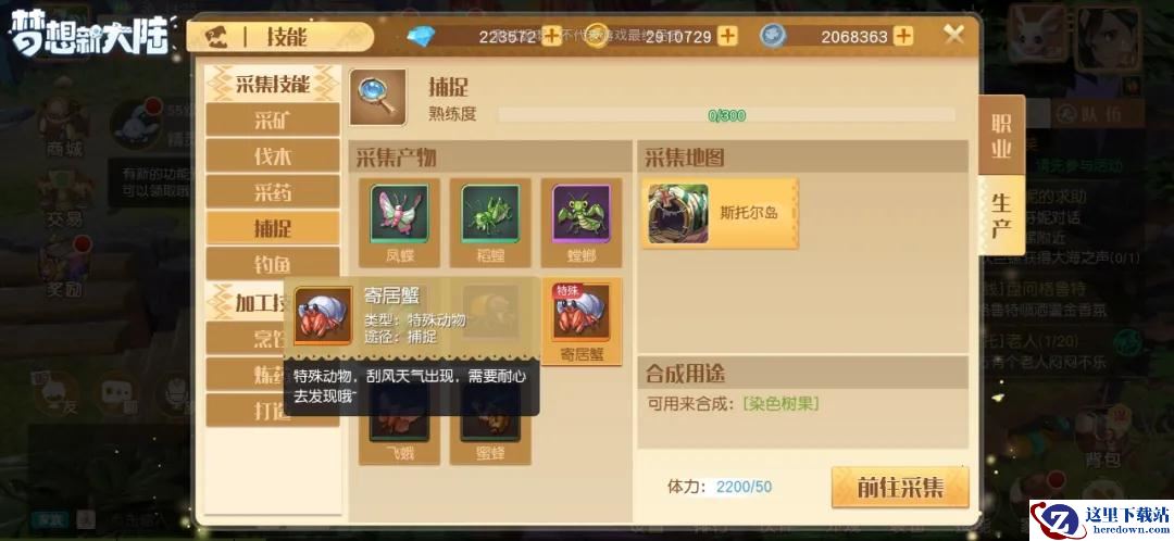 除了职业以外,生活技能对天气也有着不小的依赖呢。就像是刮风才会引出用于宠物染色的寄居蟹一样,用于装备打造的绿椰木也只有暴雨天气才会出现哦~