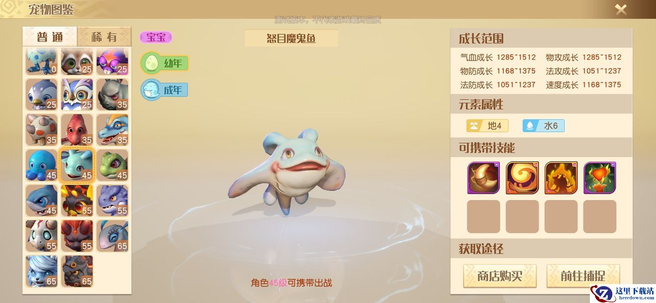 商店售卖的宠物都是野生状态,宠物等级和可携带等级一致。捕捉的宠物都是宝宝,初始等级为0。宠物可通过出战和使用经验道具获取宠物经验,从而提升等级。无论什么等级的宠物,重塑后等级归0,需要重新再提升等级。