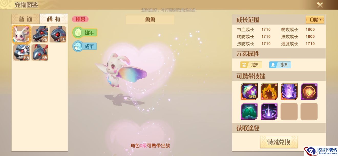 稀有宠物中的神兽,现阶段测试版本仅有一只“鲁鲁”,无携带等级需求,并且神兽养成玩法和普通宠物养成玩法有一定区别。神兽获取途径唯一,那就是神兽碎片兑换,神兽碎片获取方式包括高级藏宝图概率获得,任务赠送。神兽拥有特有技能,可携带技能有6个。