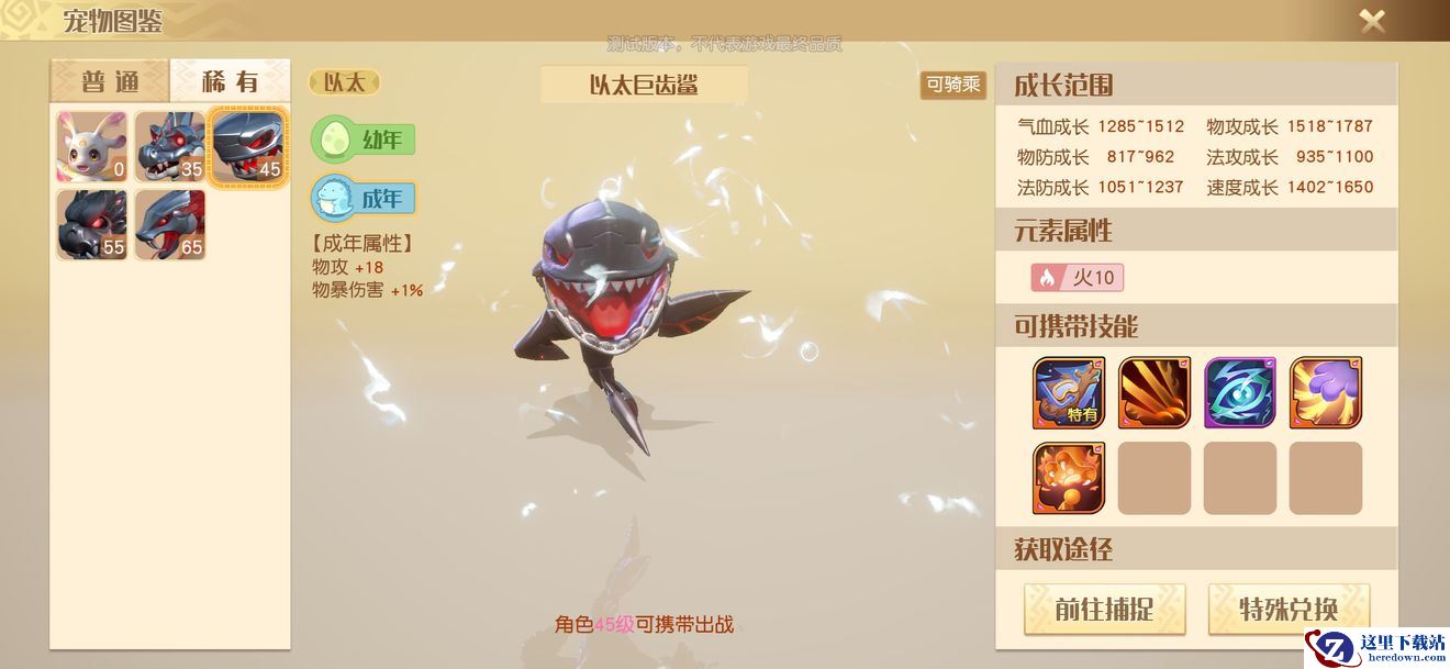 以太宠物,有携带等级要求,获取方式包括巡查地图内捕捉和使用以太元素道具兑换,以及部分活动任务产出(如挑战高阶机械,有概率产出以太宠物蛋)。以太宠物的养成玩法和普通宠物一致,只不过以太宠物比同级别普通宠物更强,毕竟以太宠物拥有特有技能,可携带5个技能,且战斗召唤技能更高级。