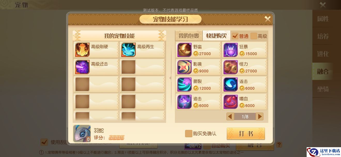 宠物的养成玩法有多种,包括提升等级,学习技能,宠物改造,宠物装备,宠物训练,宠物融合等。
