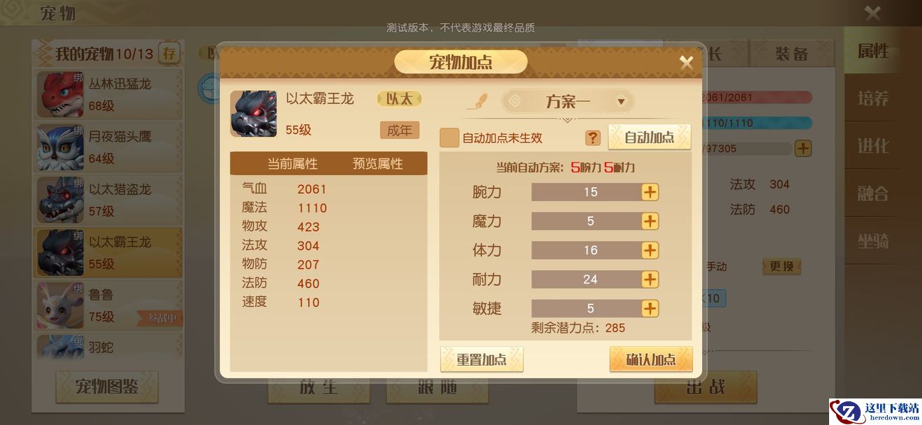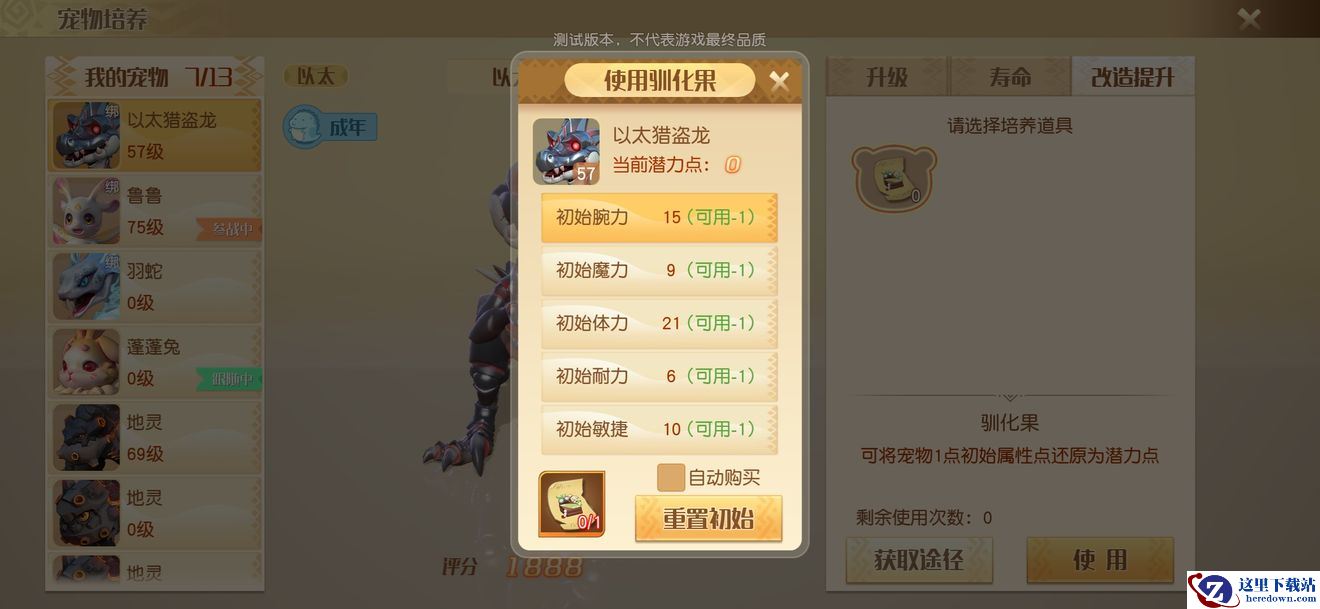 消耗道具对宠物某项原始属性点还原为潜力点,原始属性点低于5点时不可对当前项再进行改造。宠物最多可改造10次。