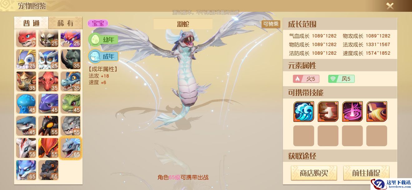 成长方向。通过宠物图鉴可以看到每一种宠物都有成长范围,不同的成长项数值区间是不同的,所以可根据宠物的成长方向来选择宠物。游戏中宠物根据成长方向,可划分为气血防御、物攻、法攻和速度四种类型,盗猎龙速度成长为主资质,属于速度型宠物;火山龟气血成长和物防成长都属于主资质,是气血防御型宠物;翼手龙法攻成长为主资质,为法攻型宠物;巨齿鲨物攻成长为主资质,是物攻型宠物。你可以根据你想要的宠物战斗方向来针对性选择宠物。