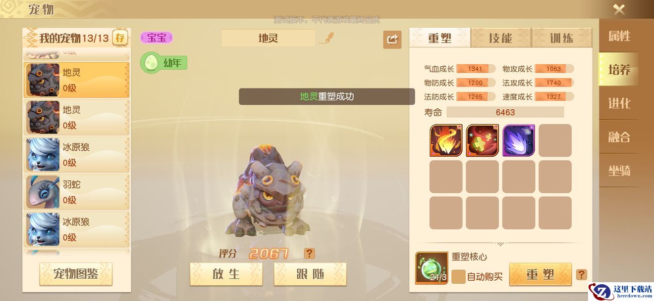 让宠物变为0级宝宝(幼年),同时会改变宠物的各项成长数值和拥有技能的个数(0~4个)。宠物宝宝等级高于60级后不能再进行重塑。普通宠物,用“重塑核心”道具对宠物进行重塑,以太宠物需要用“以太重塑核心”道具,神兽不可重塑。