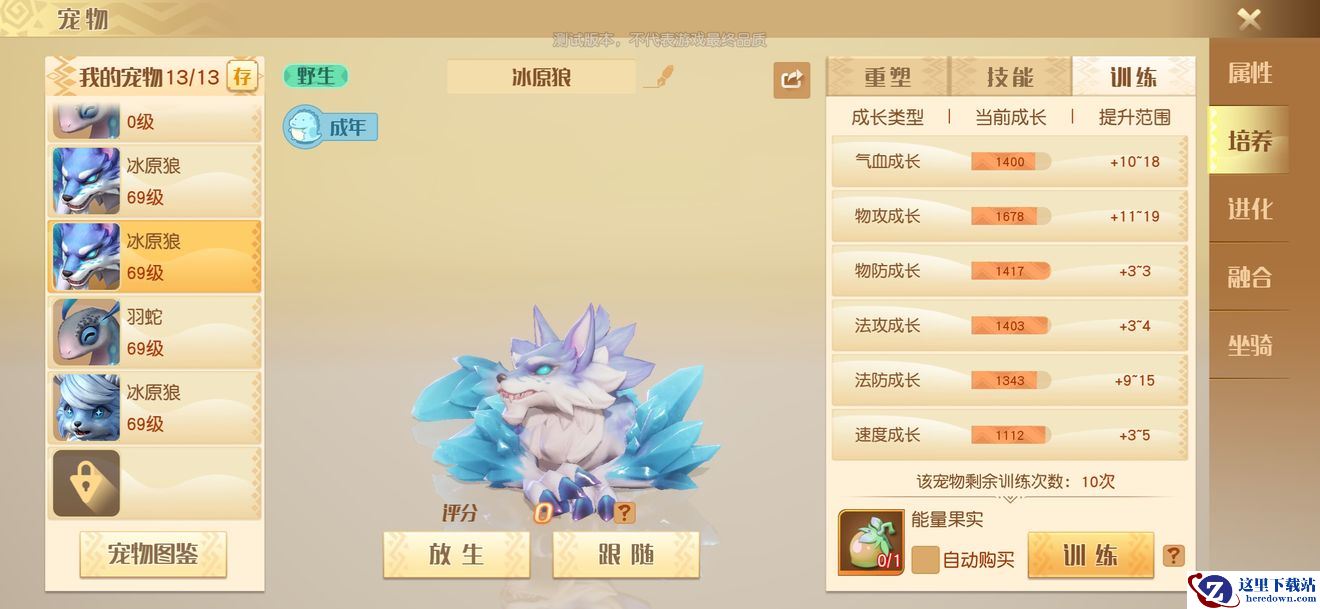 对宠物的成长进行针对性的强化,当宠物成长达到满值后不可再对当前成长项进行训练,宠物训练最多训练10次。