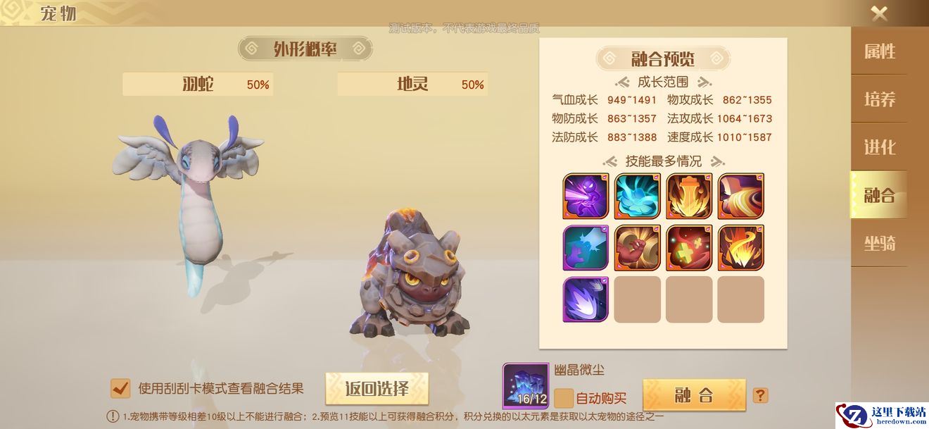 两只非野生宠物进行融合,融合时宠物可携带等级不能相差10级以上。宠物融合后种类为合成使用宠物的种类之一,技能数为0至不重复技能的总和数(总和数大于10时最多为10)。融合后宠物成长由消耗宠物的平均成长决定。神兽不能进行融合操作,以太宠物特有技能不会转移到非同种以太宠物身上。