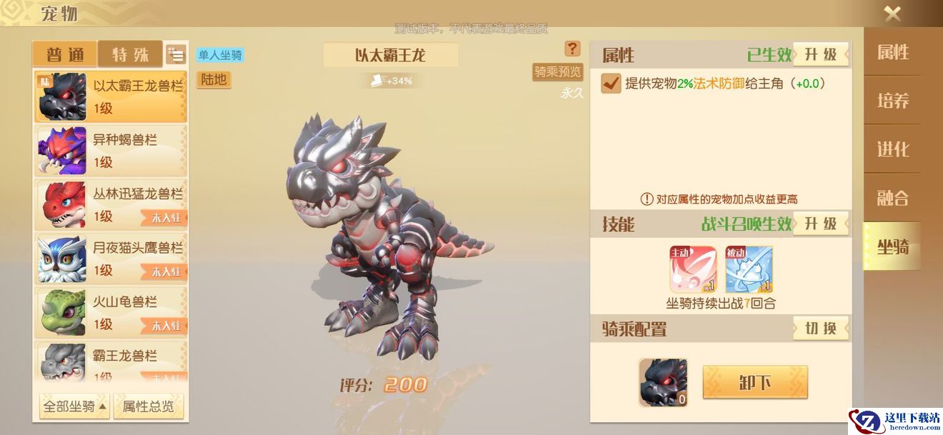 坐骑宠物。在游戏中,绝大部分宠物都是可以充当坐骑的,而且宠物在“成为”坐骑后,还能为角色提供属性加成。你可以一开始就选择这些宠物来进行培养,在你不用它们作为宠物出战后,还可以配置到坐骑兽栏中出战。宠物入驻兽栏后,角色能获得百分比属性加成。