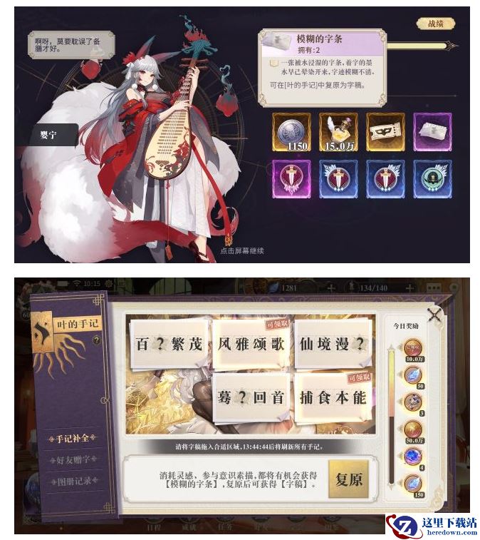 将获得的[文字]拖入活动页面对应的纸条中,便可以复原字条,从而获得右侧的每日奖励。