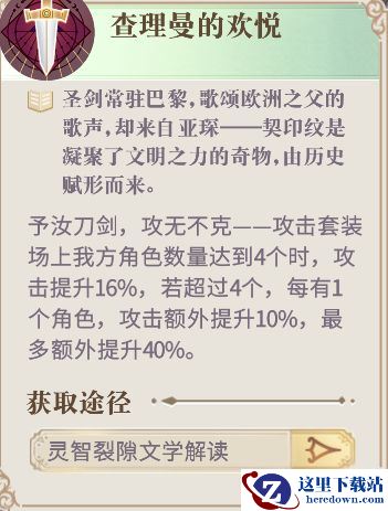 因为奥西里斯的被动技能非常依赖队友数量,在队伍搭配上一般是和《亚森·罗宾探案集》罗宾以及《死海文书》伊芙组成召唤队,所以契印纹套装推荐“查理曼的欢悦”,它可以根据场上我方角色数量提升攻击力。而契印纹属性选择和强化时,我们可以优先追求攻击力和暴击。