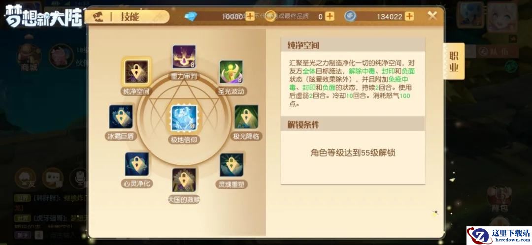 怒气技—纯净空间,神谕召唤净化之圣光,解除全体友方中毒、封印和负面状态,并且附加免疫中毒、封印和负面的状态,圣光将赋予队友勇气和力量,坚定的胜利信念来源于神谕的可靠力量。