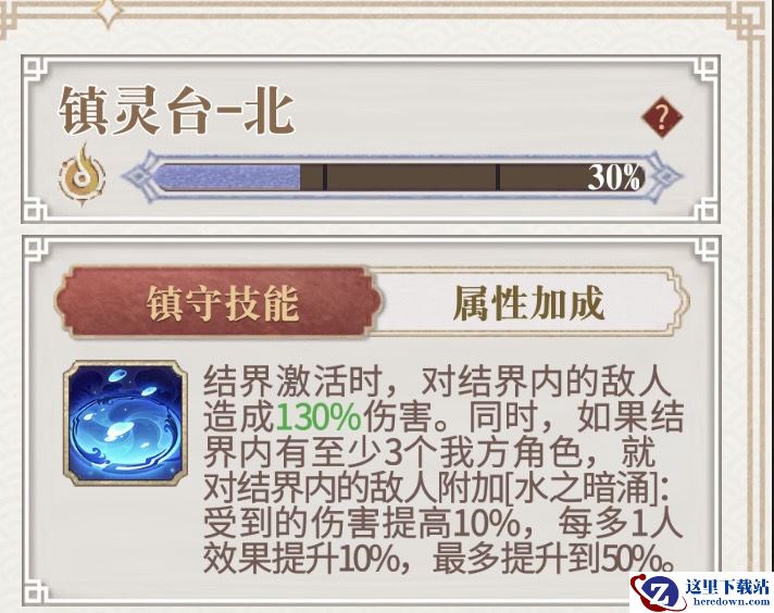 结界激活时,对结界内的敌人造成130%伤害。同时,如果结界内至少有3个我方角色,就对结界内的敌人附加[水之暗涌]:受到的伤害提高10%,每多1人效果提升10%,最多提升到50%