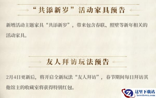 2月4日更新后,将开启全新玩法“友人拜访”,春节期间每日拜访其他馆主的收藏室将获得特别红包。