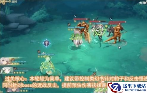 本轮较为简单,建议带控制类幻书针对豹子和反击怪进行限制,同时针对boss的近战反击,提前预估伤害抉择是否出手,还是暂退等待治疗。