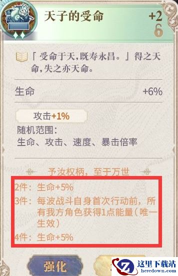 可以提升攸宁60%的治疗量,装上这套契印纹,攸宁技能可以恢复其他角色近一半的生命值,奶量恐怖,如果阵容中需要大量治疗,或者在面对局时很久的战斗时,可以用装配这套契印纹,确保阵容随时都能有一个很健康的状态。