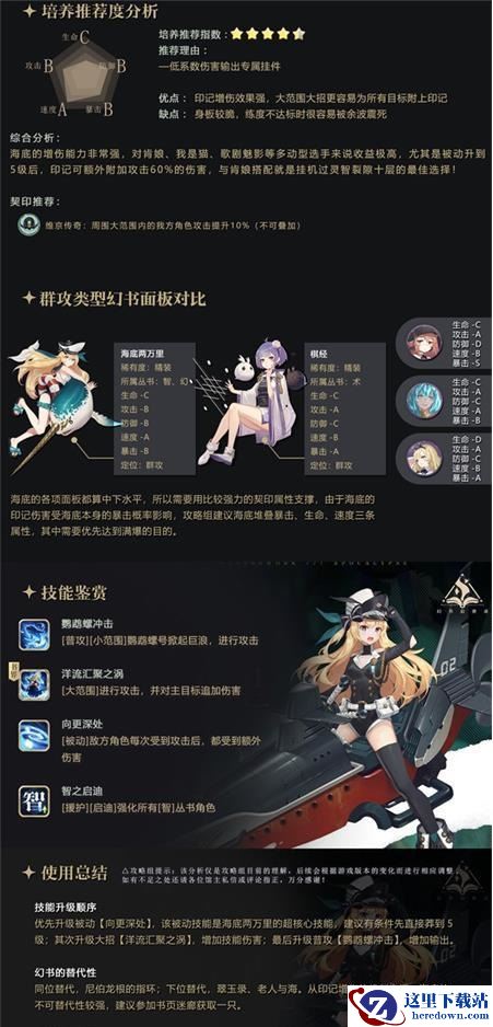 首先是日常任务推图,海底的群体印记增伤还是非常好用的;其次是boss地图(学会boss等),敌方单位少,印记收益低,不推荐;最后是pvp战斗,目前的pvp环境中比较喜欢功能性较强的幻书,如海底这种直接增伤的秒人的幻书并不适合出现,因此也不推荐。
