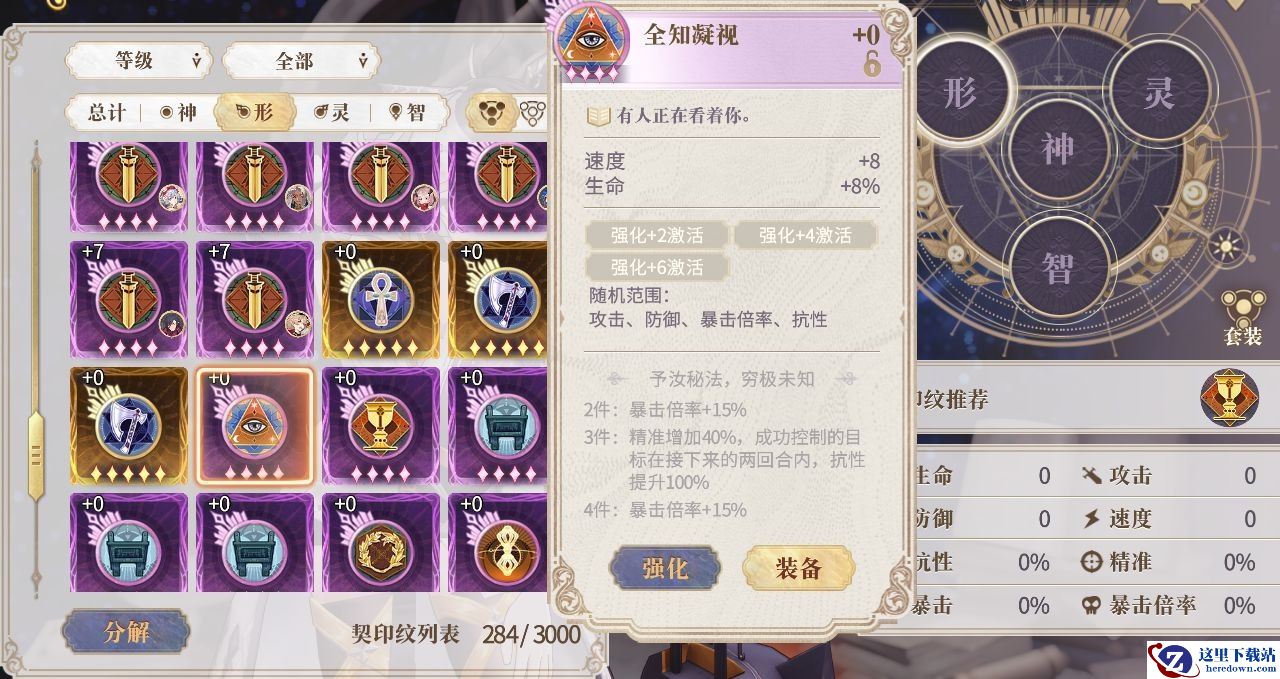 现版本契印纹总共有18种套装效果,每种套装都有各自特有的激活效果,2件套和4件套效果相同,同为百分比属性加成,3件套的效果则为被动效果,相当于给幻书增加了一个被动技能,十分强势。智、灵、形3个位置只有一种套装属性,神之位则有两种不同套装属性,我们利用这一点,可以将4个位置契印纹组成3+2套装搭配模式,激活了3件套效果还利用上了另一种套装的2件套属性加成。