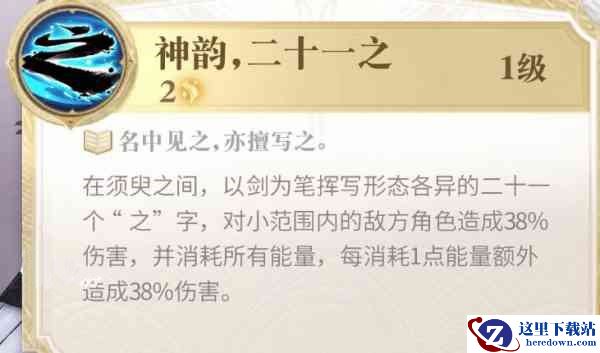 【二技能-神韵,二十一之】核心技能,可以对小范围目标造成伤害,同时可以消耗全部能量提升伤害;