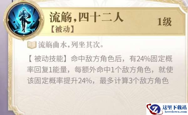 【被动技能-流觞,四十二人】每次命中目标都有概率获得1点能量,可以侧面提升一技能和二技能的伤害;